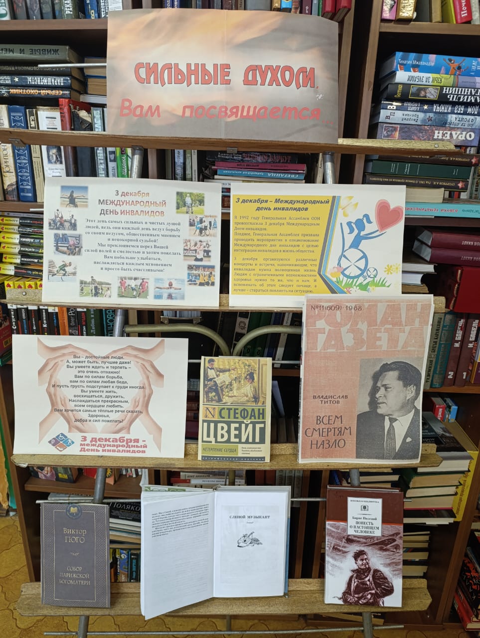 3 декабря отмечается Международный день инвалидов. Его цель - привлечь внимание к проблемам людей с ограниченными возможностями здоровья, защитить их права и способствовать интеграции в общественную жизнь. В Княжьегорской билиотеке к этому дню оформлена книжная выставка «Сильные духом, Вам посвящается». На выставке представлена художественная литература о сильных духом людях: С. Цвейга «Нетерпение сердца», В.Г. Короленко «Слепой музыкант», Б.Н. Полевого «Повесть о настоящем человеке», В. Титов «Всем смертям назло» и другие.